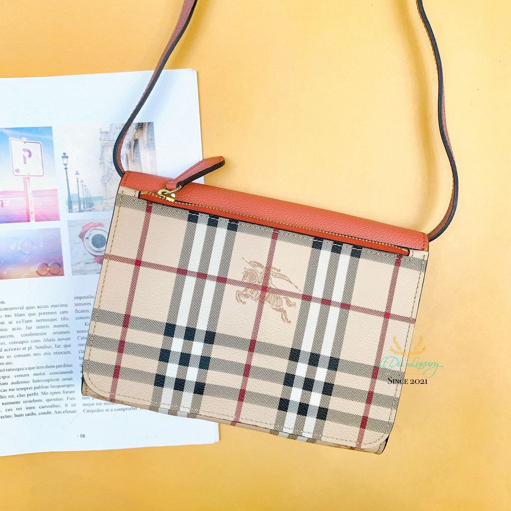 Burberry 珊瑚粉x黃x格紋 戰馬斜背包